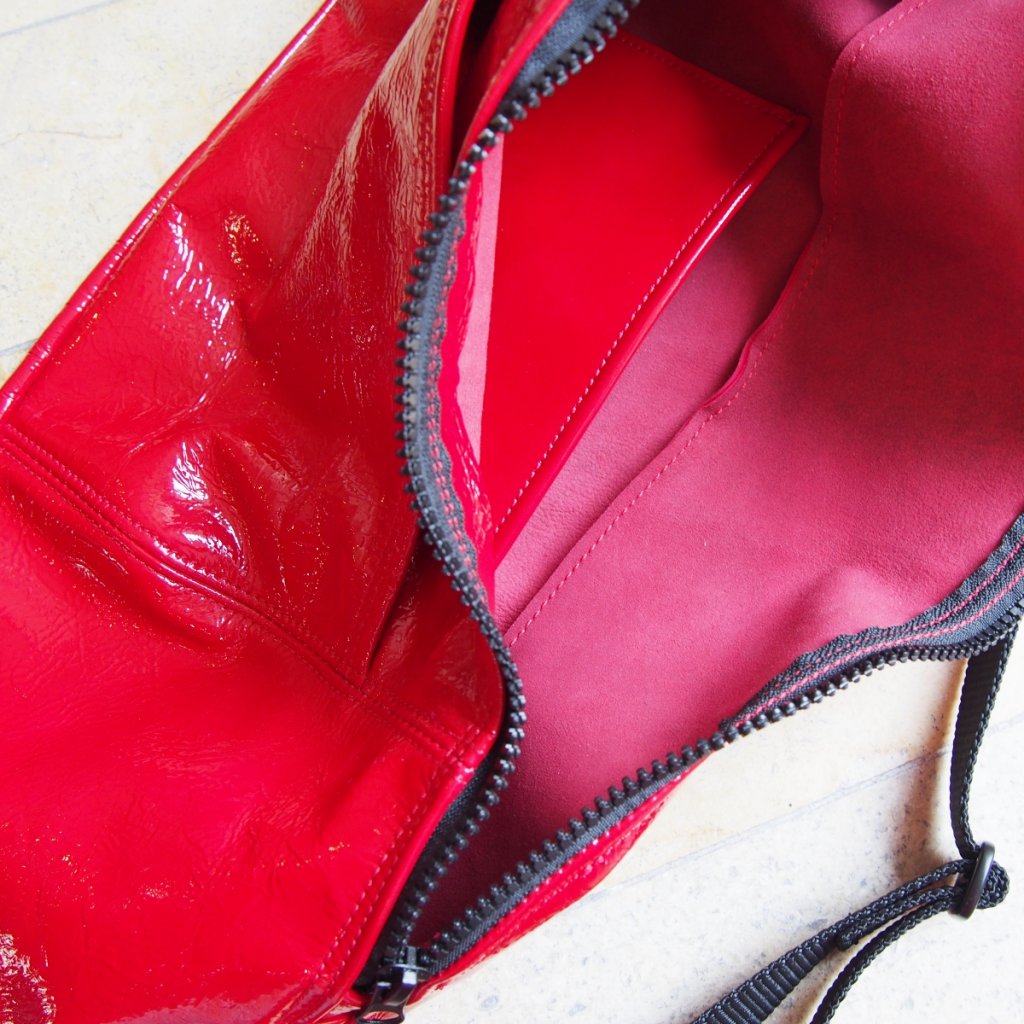 Lesklá jako čerstvě nanesený lak a stejně neústupná. Latexová kůže hází odlesky a zrcadlí okolí, ale neztrácí tvar. Červené logo na červeném těle mluví jasně: žádné ozdoby, jen postoj. Zip, popruh i kov – všechno černé, minimalistické, ničím nerušené.
