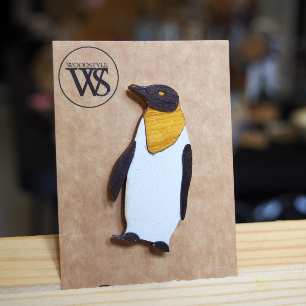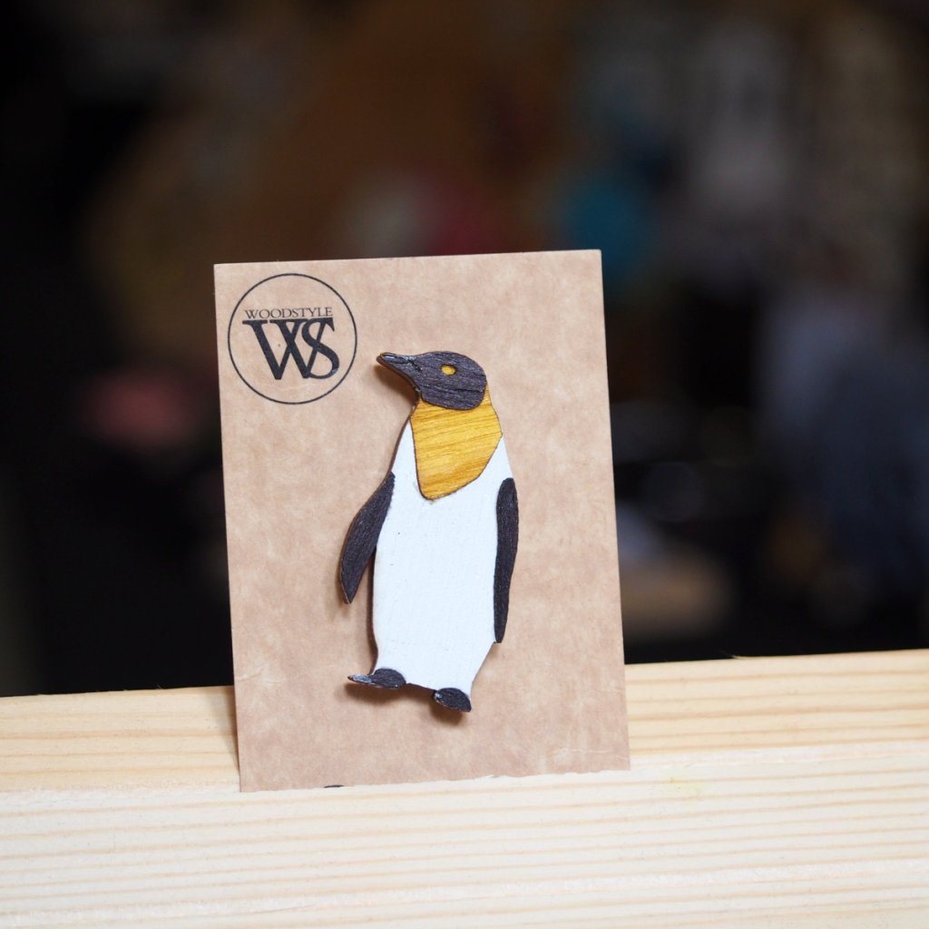 Originální brož z dřevěných dýh ve tvaru tučňáka. Zapínání je na magnet.