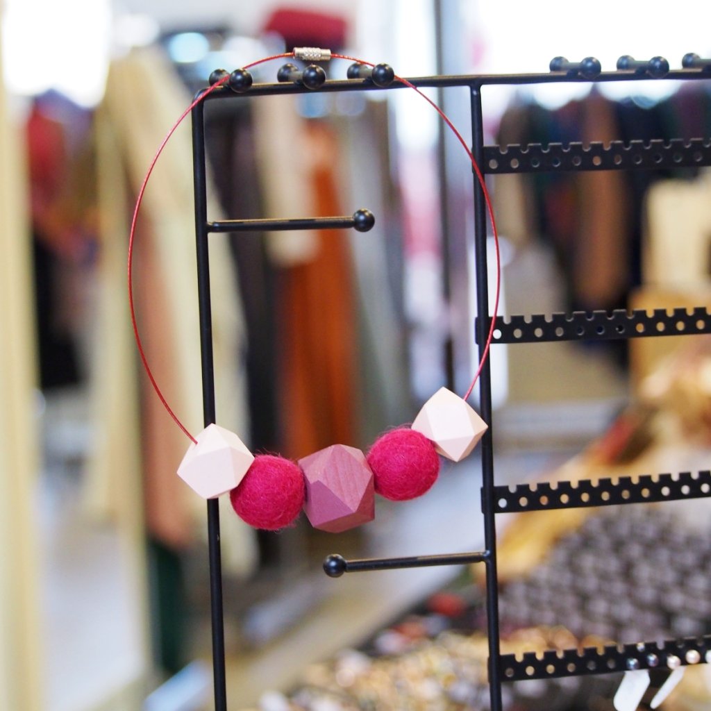 Na vínovém ocelovém lanku se střídají světle růžové dřevěné korálky o velikosti 1,5 cm se dvěma plstěnými vínovými o průměru 2 cm. Dominantou je vínový dřevěný korálek 2,5 cm, který celé kompozici dodává jistotu a hloubku. Výsledek je doplněk, který působí sladěně, ale ne sladce.