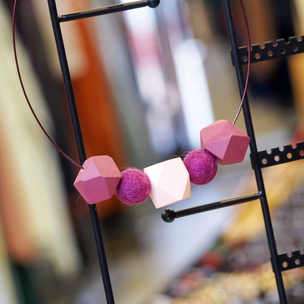 Na vínovém ocelovém lanku se střídají dřevěné korálky o velikosti 2 cm s plstěnými kuličkami 1,5 cm ve stejné barvě. Uprostřed stojí světle růžový dřevěný korálek o průměru 2,5 cm, který vytváří kontrast jako světlo lampy dopadající na starý dům za soumraku. Výsledek je šperk, který se nevnucuje, ale pamatuje se.