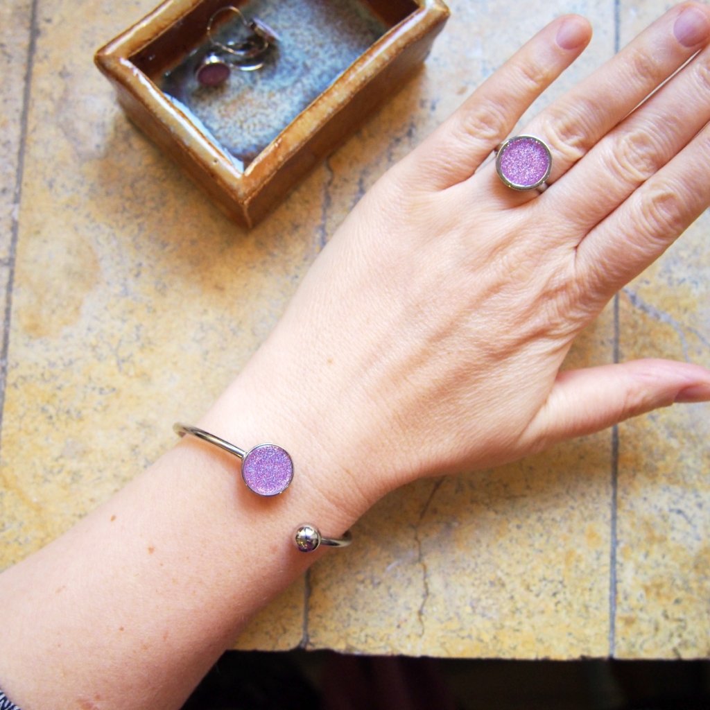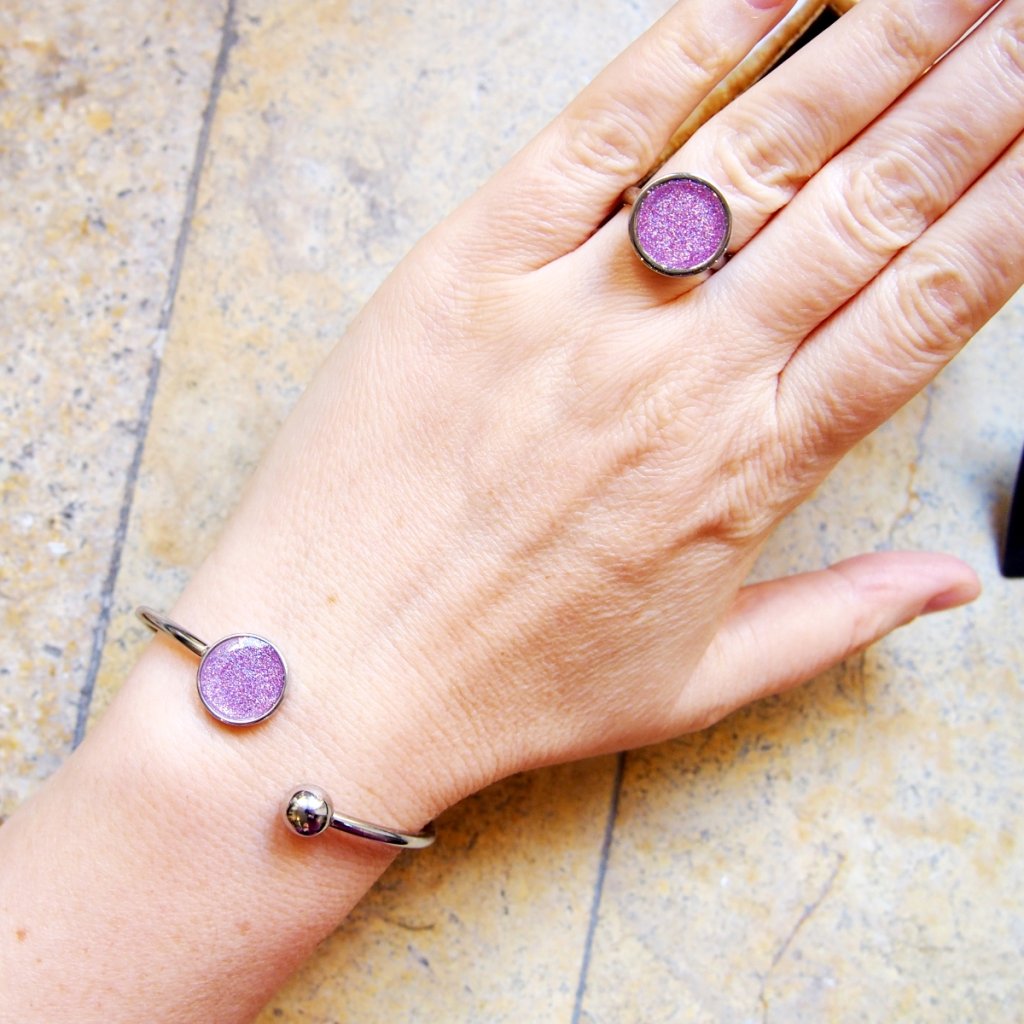 Celokovový náramek zachycuje drobné růžové třpytky, které se blyští v světlém betonu jako drobné paprsky světla. Stříbrný kov tvoří pevný rám obruče, zatímco beton dodává texturu a hloubku, zvýrazněnou čirou pryskyřicí. Povrch chrání dekor, takže náramek zůstává jasný a odolný. Každý kus je originál, vyrobený v Česku.