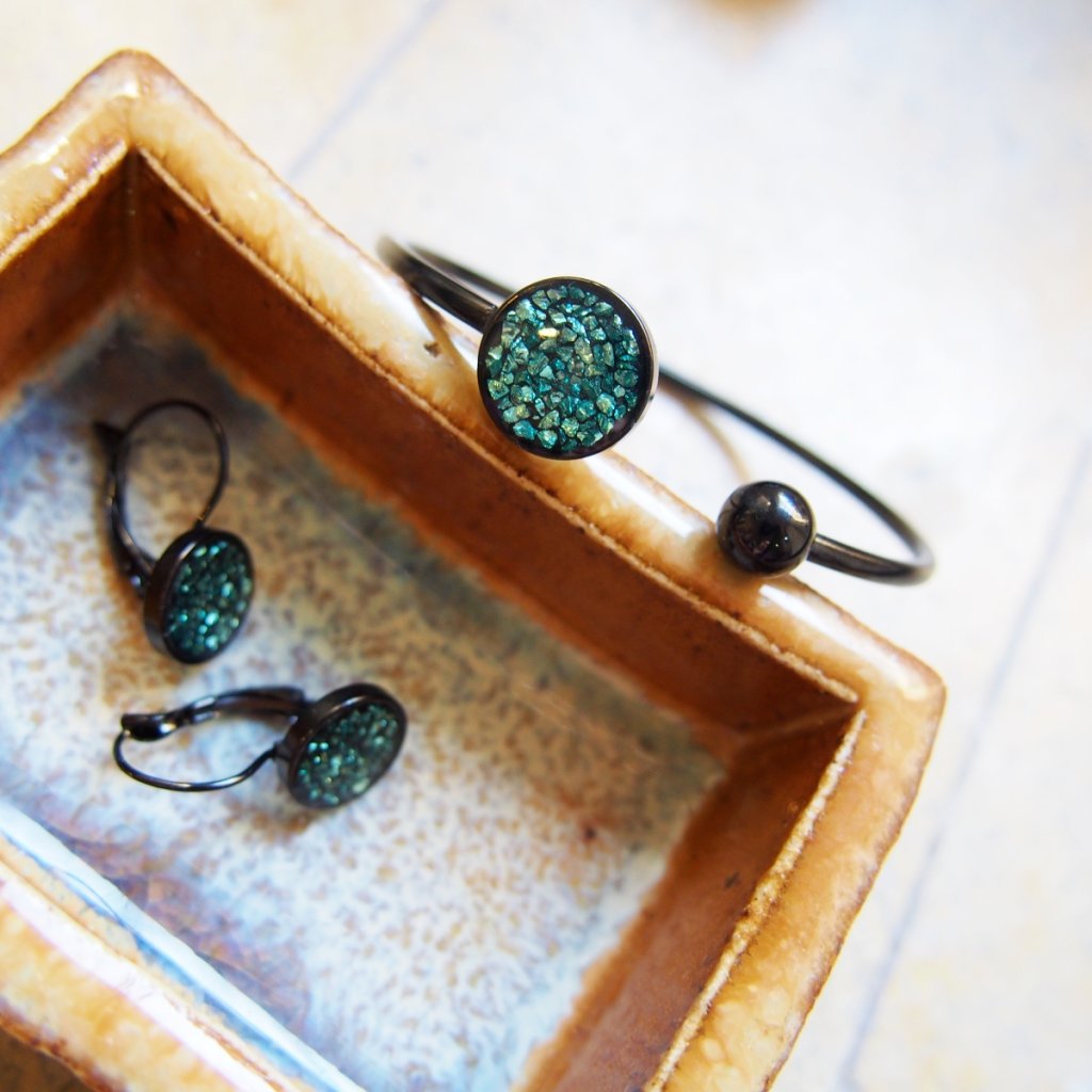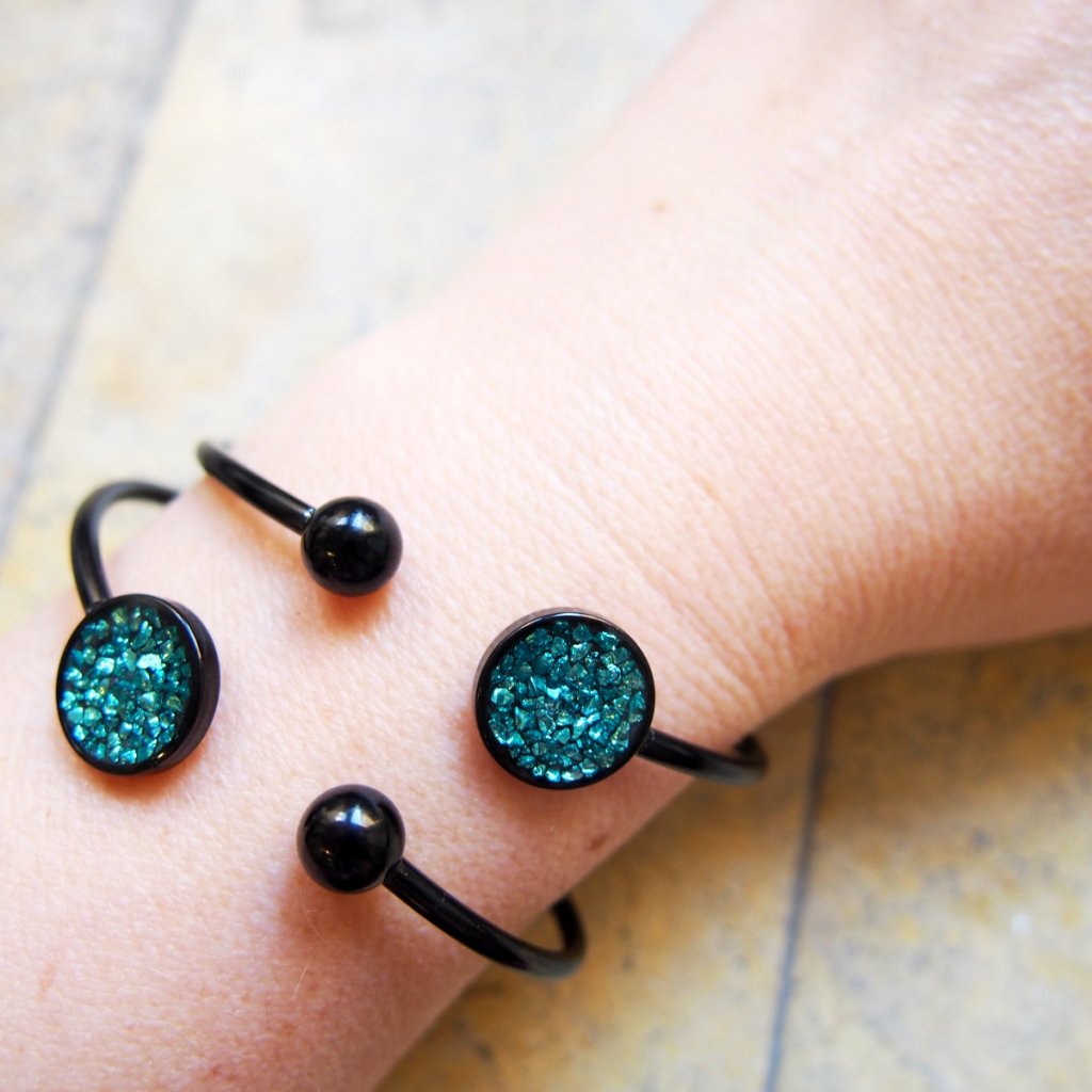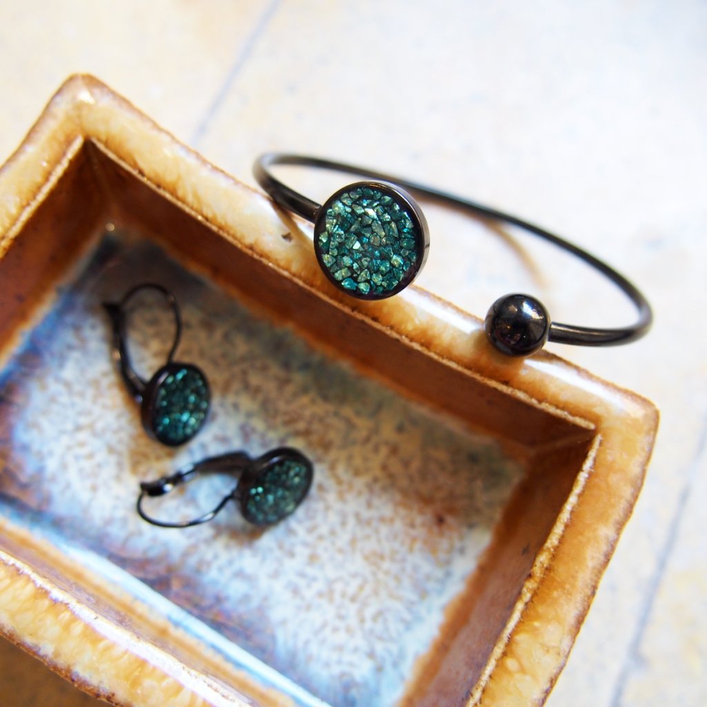 Tento náramek s ozdobou o průměru 14 mm spojuje černý beton s černým kovem, zatímco zelená sklíčka jemně zachycují světlo a dodávají šperku jiskru. Obrouč je flexibilní a přizpůsobí se obvodu zápěstí až do 18 cm, takže pohodlně sedí a zároveň upoutá pozornost.