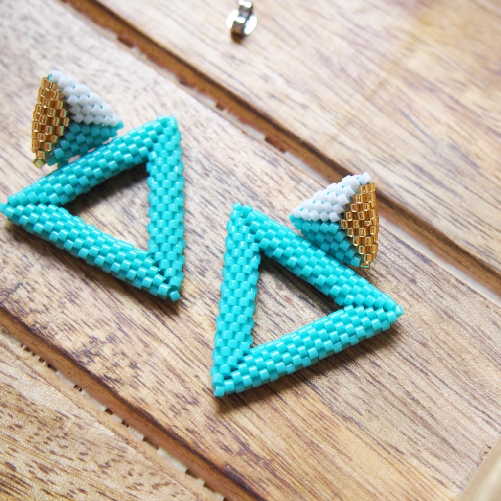 Tyrkysové náušnice ve tvaru trojúhelníku se zlatým a bílým akcentem. Rovnice léta.