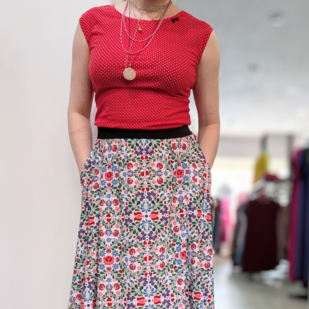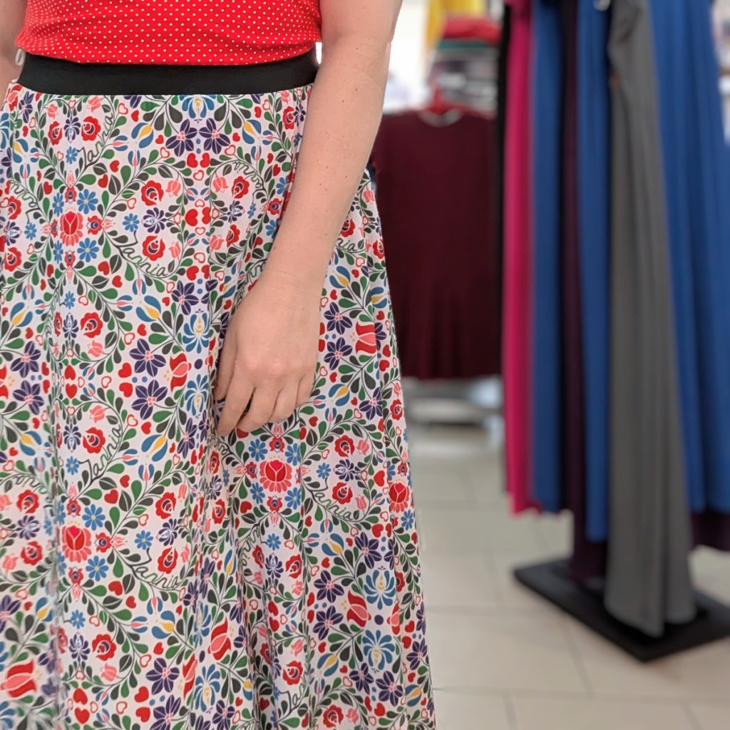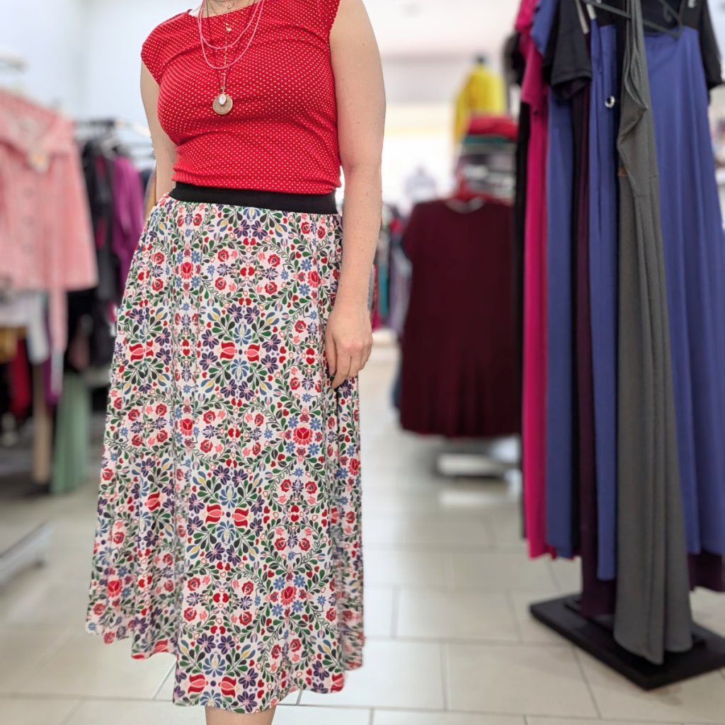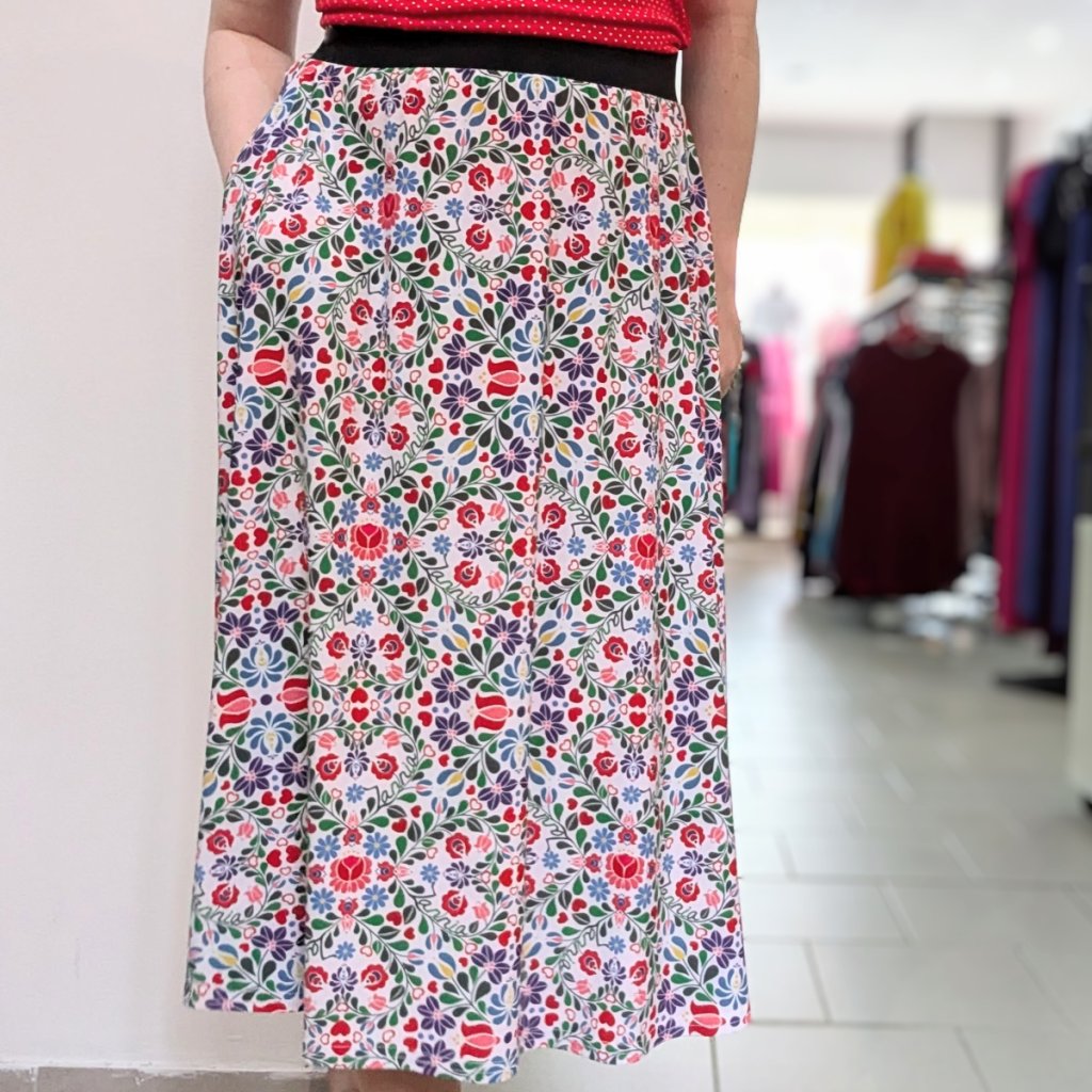 Sukně je ušitá z příjemného materiálu (95 % polyester, 5 % elastan), krásně drží tvar a díky elastickému pasu se snadno přizpůsobí vaší postavě. Praktické kapsy ve švu oceníte na drobnosti i ruce. Barevný folklórní vzor je nepřehlédnutelný a snadno kombinovatelný – zkuste ji s jednoduchým topem, puntíky nebo třeba džínovou bundou.