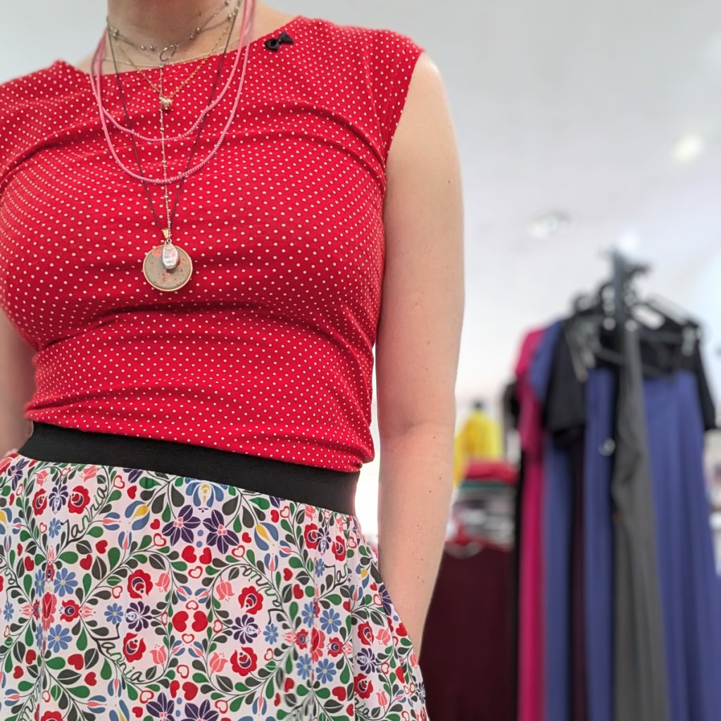 Tip na outfit: Zkombinuj s červeným puntíkatým topem od Krejčovství Magda a výrazným šperkem od Beton Beads. Budeš nepřehlédnutelná – a přitom pořád sama sebou.