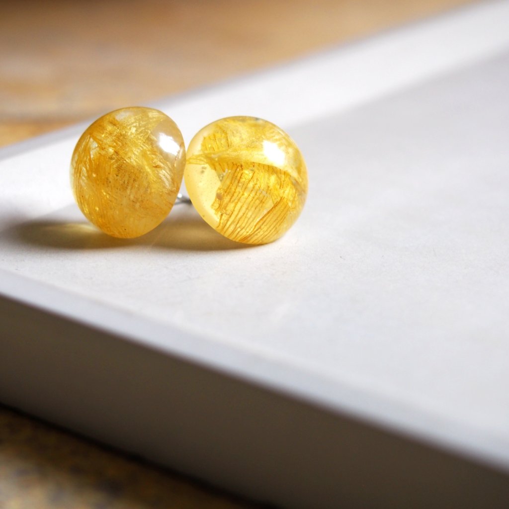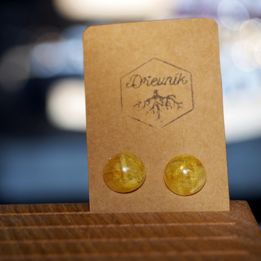 Vznikají v české dílně značky Dřevník. Lokální výroba, autorský design a šperk, který vzniká pomalu: květ se usuší, zalije do pryskyřice a nakonec spojí s puzetou z chirurgické oceli. Výsledek je lehký, jemný, nečekaně výrazný. Jako slunce zamčené v malé kapce.
