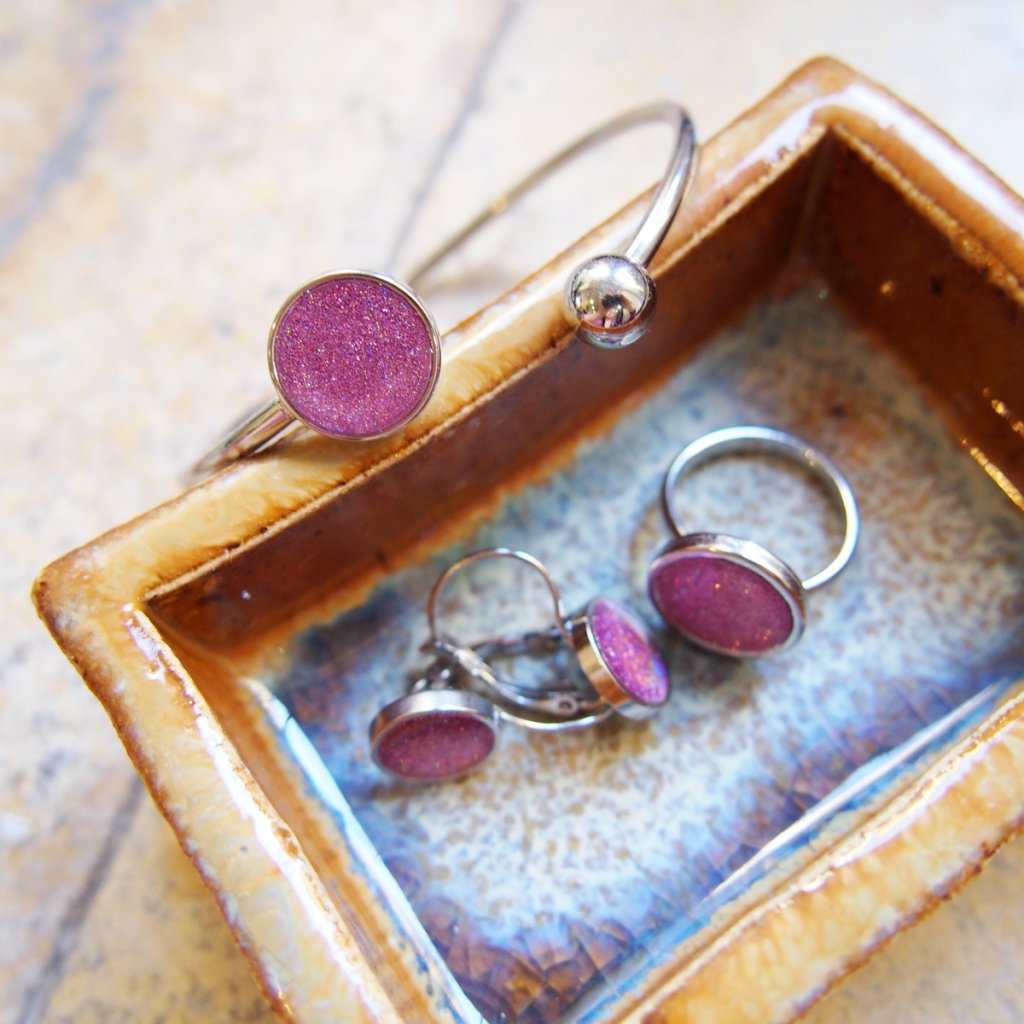 Materiál: nerezová ocel AISI 304 (UNS S30400), šperkařský beton, metalické drobné třpytky, pryskyřice