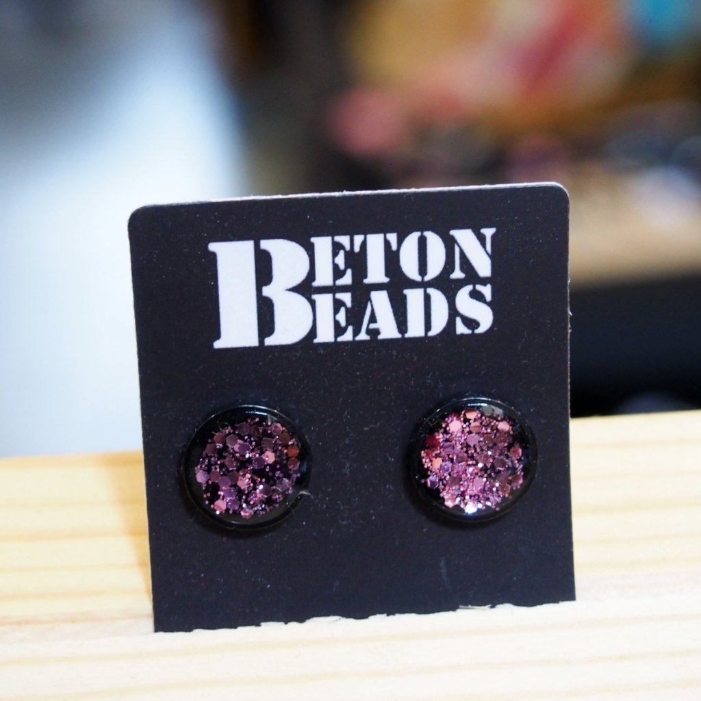 Tyto náušnice vypadají, jako by někdo zachytil západ slunce v kapce noci. Černý beton tvoří tmavý základ, na kterém růžové třpytky jiskří jako poslední paprsky světla. Černý kov rámuje každý detail a čirá pryskyřice dodává hloubku, která nechá třpytky zářit při každém pohybu hlavy. Každý pár je vyroben v Česku a žádný není stejný – třpytky se nikdy neuspořádají stejně.