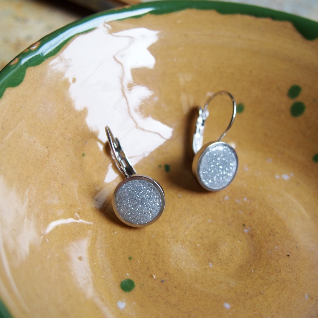 Z jemného kružku ze stříbrného kovu se pohupuje kulatá ozdoba o průměru 12 mm. Uvnitř se blyští stříbrné třpytky zalité čirou pryskyřicí – pokaždé zachytí světlo jinak, takže každé otočení hlavy rozzáří nový odlesk.