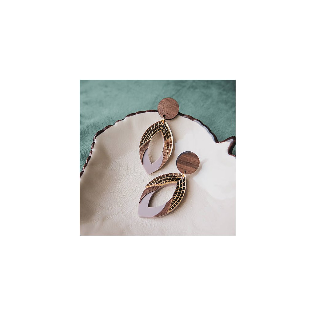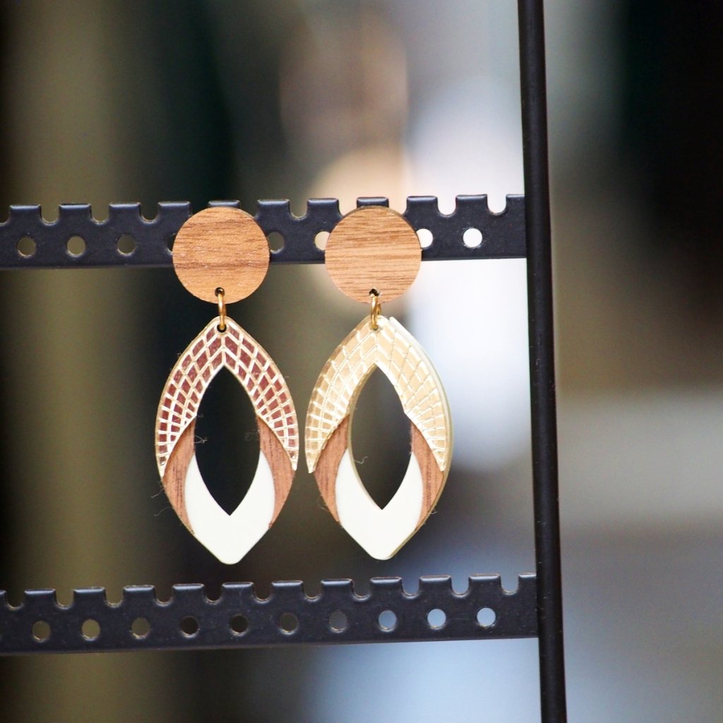 Podlouhlý tvar, světle zlatý, hnědý a měkce bílý tón a kombinace akrylátového skla s dřevem vytvářejí kompozici, která působí jako malá světelná kresba. Náušnice se díky své velikosti 5,5 × 2,5 cm drží přesně na hranici mezi decentností a výrazem, což z nich dělá ideální volbu pro dny, kdy chceš dodat outfitu jemnou, ale přesto viditelnou barvu.