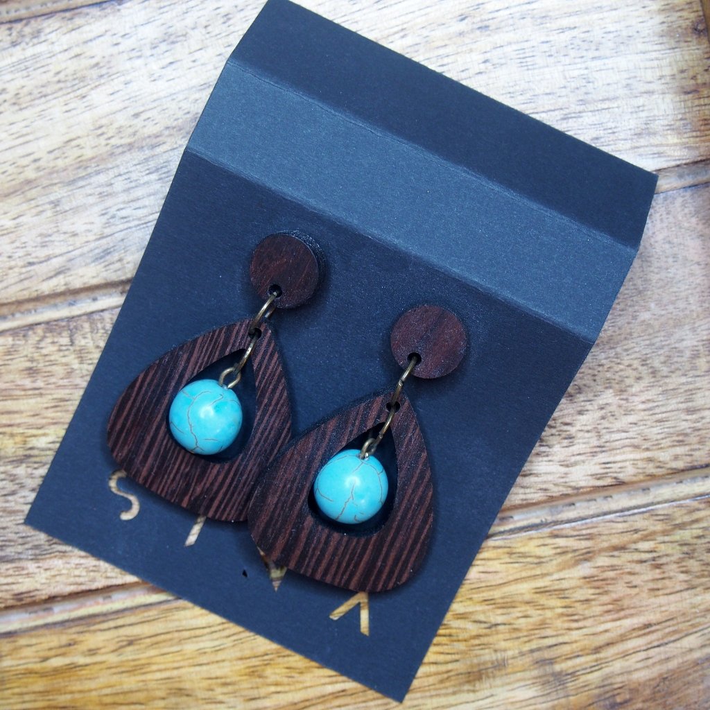 Dřevěné náušnice s korálkem kombinují modrou a hnědou. Na uších jsou výrazné a nepřehlédnete je. Pro kapku tyrkysově modré ke každému outfitu.