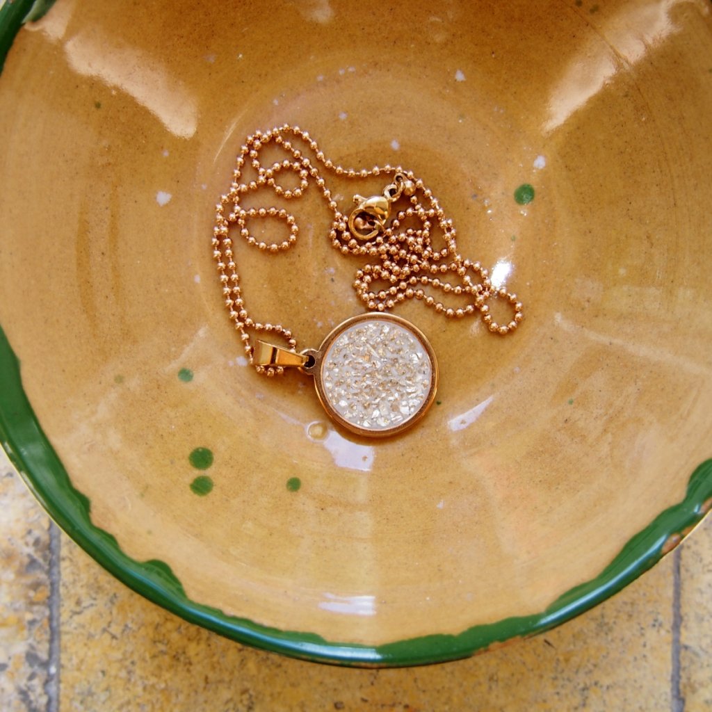 Přívěsek v barvě rose gold přitahuje pohledy svou hrou kontrastů. V kulatém lůžku je zasazen světlý beton, který zdobí drobná zrnka růžově zlatého skla. Průměr přívěsku je 18 mm – akorát na to, aby působil elegantně a přitom byl dost výrazný, aby zaujal. Přívěsek je zalitý pryskyřicí, má hladký povrch a nikde se nezadrhává.