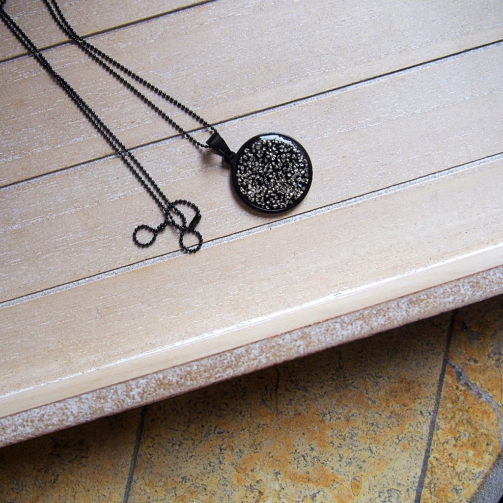 Náhrdelník je vyrobený ze šperkařského betonu a nerezového kovu. Beton je tmavý, zdobený stříbrnými sklíčky s odlesky a přelakovaný průhledným lakem. Díky tomu má hladký povrch a nikde se nezadrhává. Navíc se leskne a blyští na metry daleko. Kovové detaily jsou v černé barvě. Přívěšek je na černém kovovém řetízku, ten je dlouhý 60 cm. Přívěšek má průměr 28 mm.