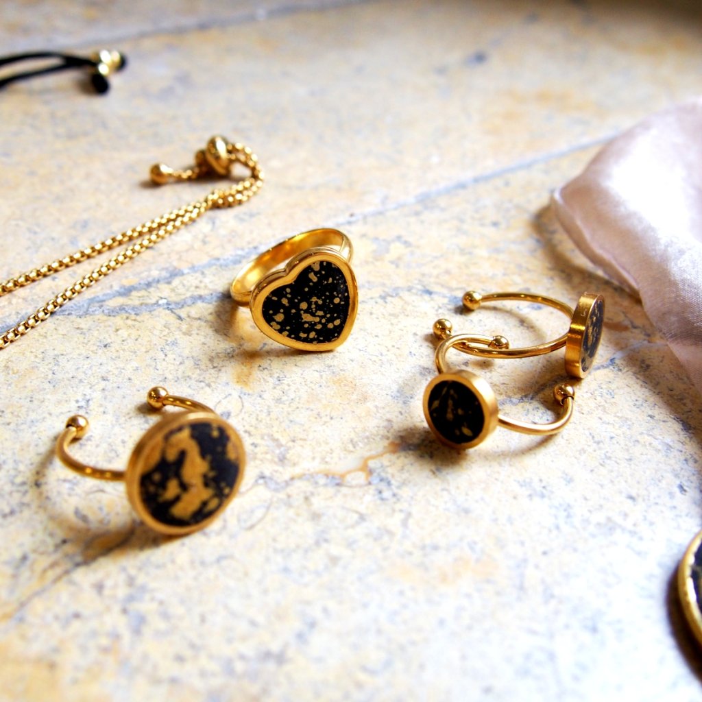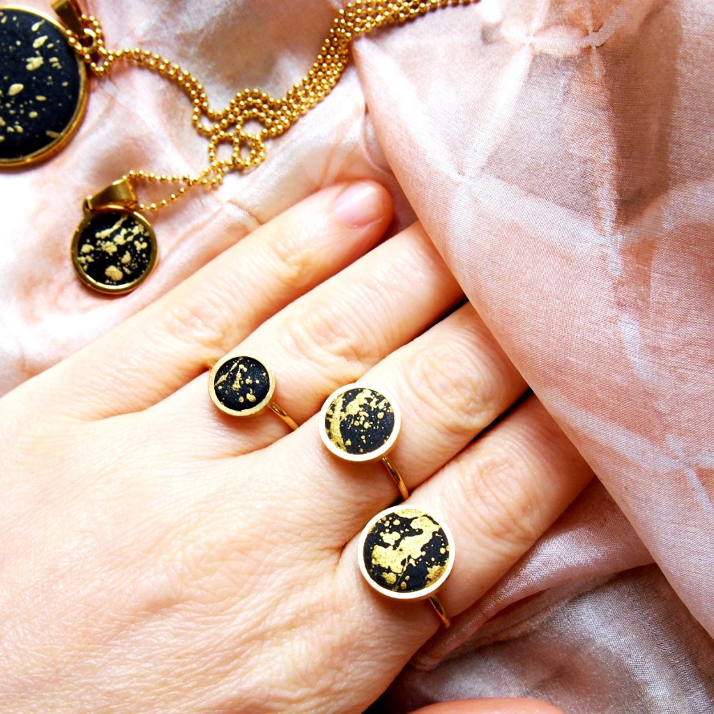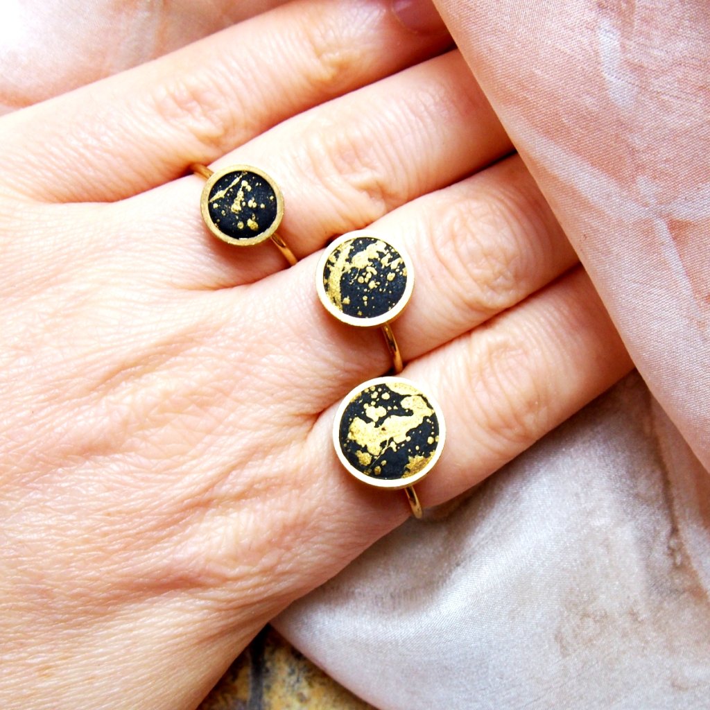 Malý vesmír na tvém prstu. Minimalistický prstýnek z tmavého šperkařského betonu se zlatými cákanci se vyrábí ve třech velikostech ozdob – 10, 12 a 14 mm. Můžeš si vybrat ten, který ti sedí nejvíc – decentní bodku, střední rovnováhu nebo odvážnější zrcadlo nálady. Díky otevřenému tvaru se prsten přizpůsobí velikosti tvého prstu.