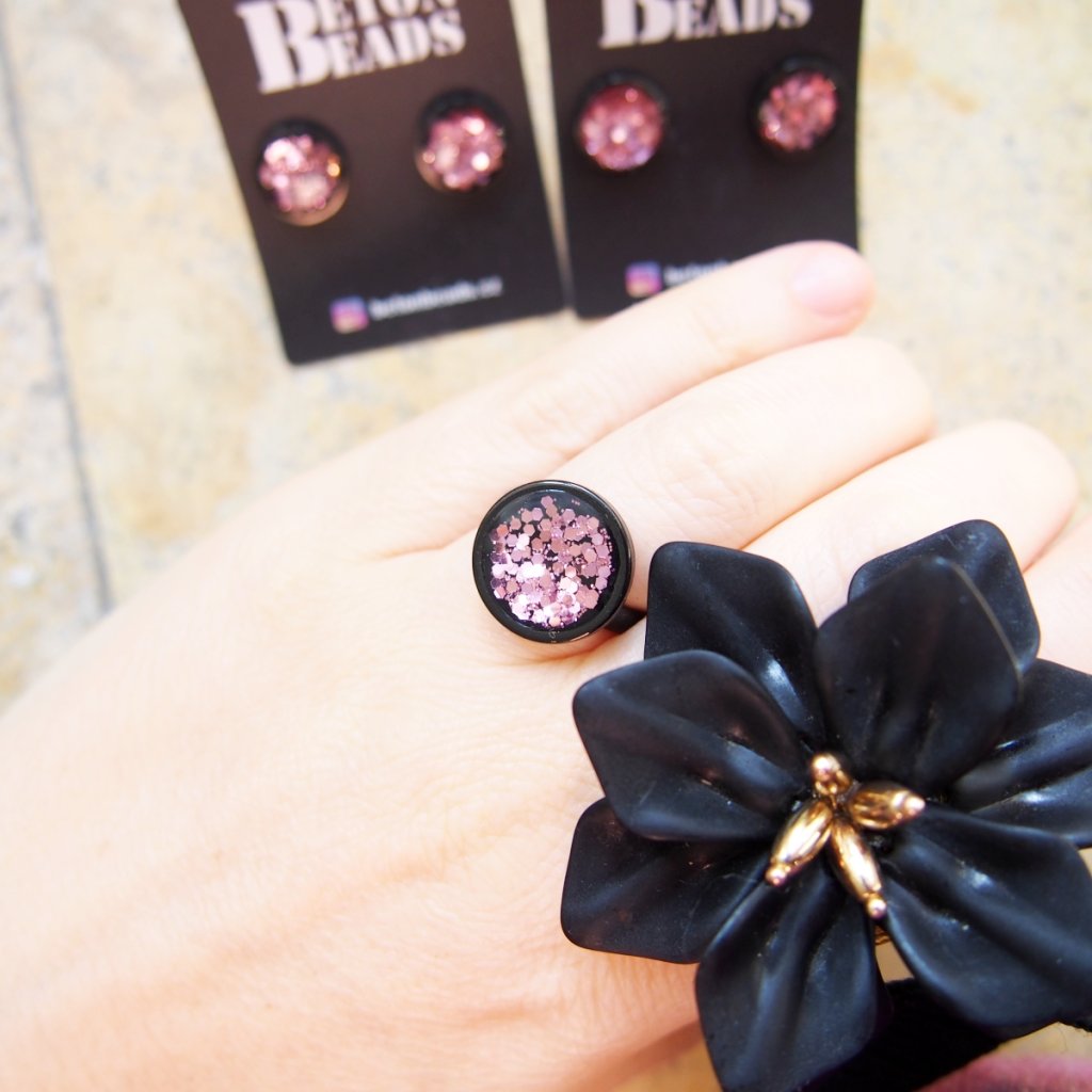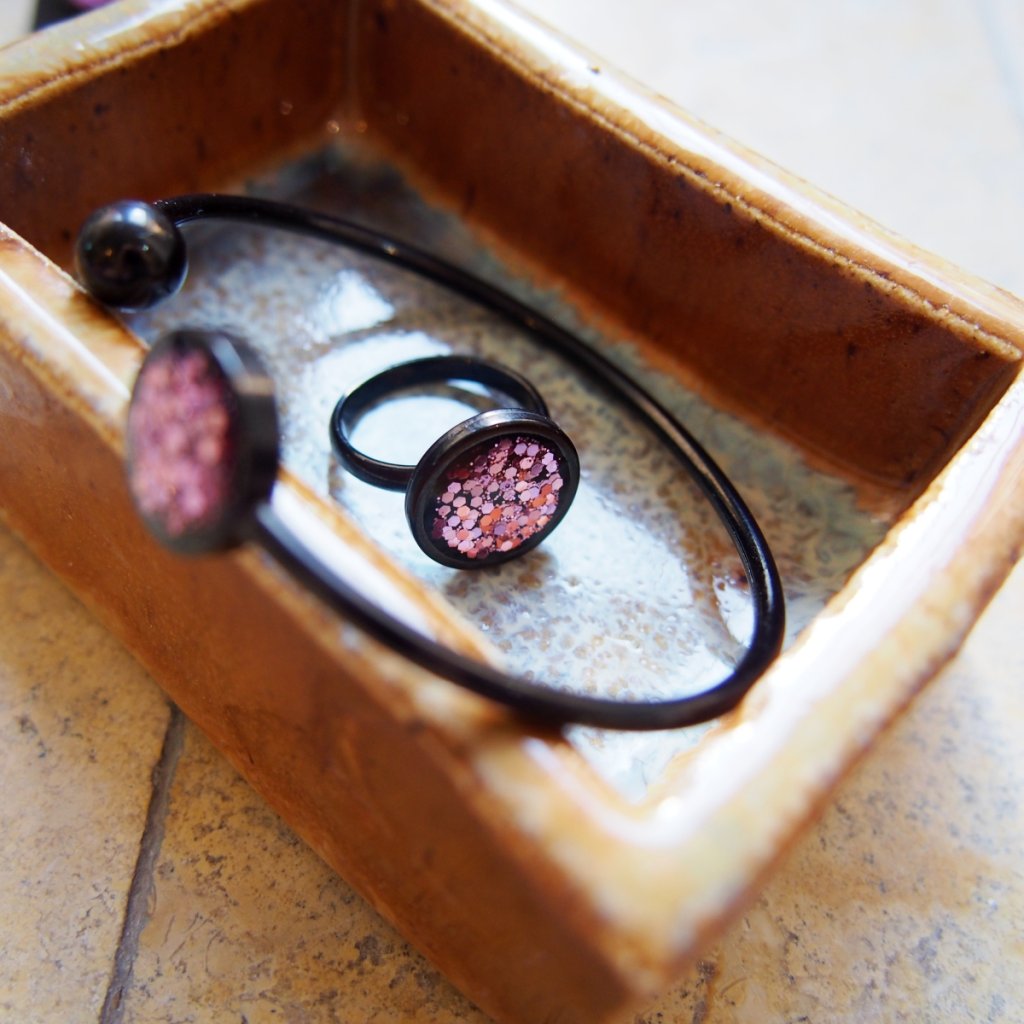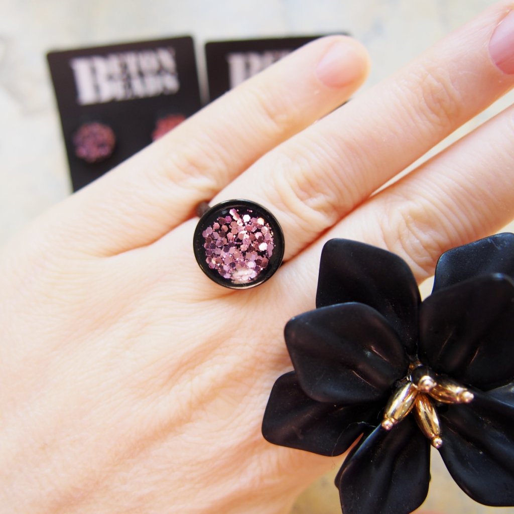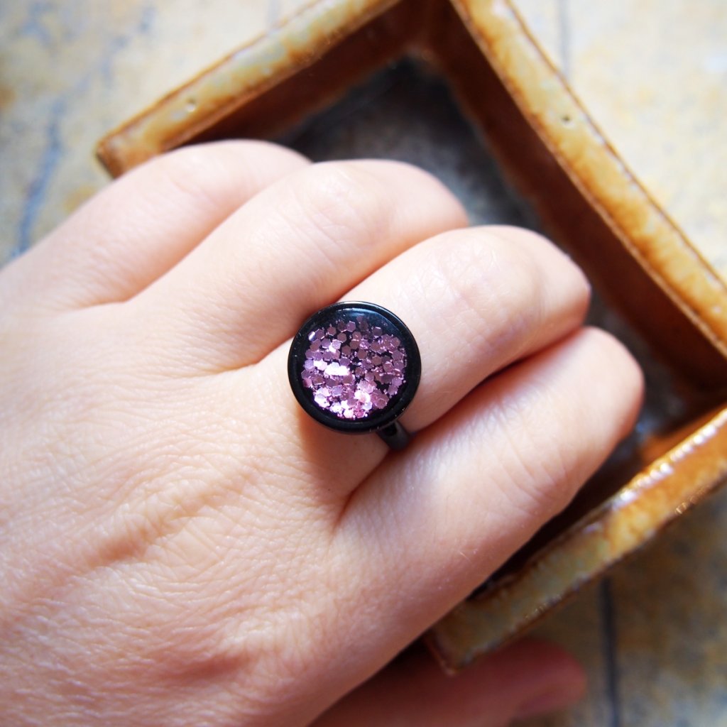 Černá duše prstenu je schovaná za světle růžovými třpytkami.