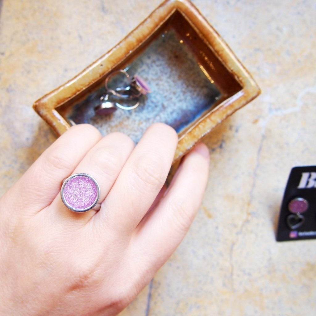 Tento prsten evokuje jemný záblesk růžového světla zachyceného v betonu. Světlý beton tvoří základ, ve kterém se drobné růžové metalické třpytky blyští a mění odstíny při každém pohybu ruky. Stříbrný kov rámuje lůžko a čirá pryskyřice dodává hloubku a chrání dekor, takže třpytky zůstávají jasné. Každý kus je originál, vyrobený v Česku, a žádný prsten nevypadá úplně stejně.