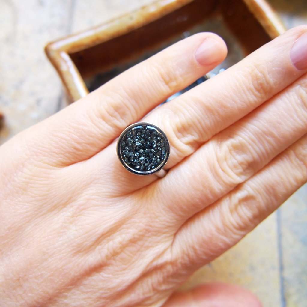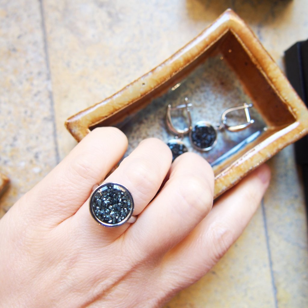 Tento prsten velikosti 55 spojuje stříbrný kov s černým betonem, v němž se blyští stříbrná sklíčka – každý pohyb ruky rozsvítí jemné odlesky a vytváří hru světla. Průměr ozdoby 14 mm dává šperku výraz, aniž by přehlušil eleganci prstu.