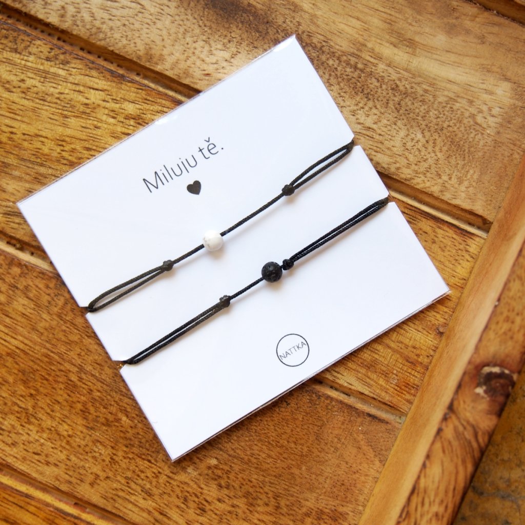 Náramky jsou balené na dárkové kartičce s věnováním a chráněné v průhledném obalu. Díky posuvnému uzlu sednou na každé zápěstí a dají se nosit dohromady nebo samostatně. Ručně vyrobeno v Česku, s láskou a pod značkou Nattka.