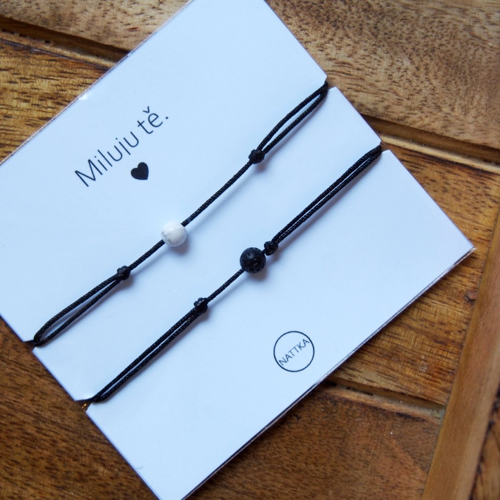Jsou oba náramky stejné? Ano, dva stejné náramky pro dvě blízké osoby. A nebo můžete vybrat sadu s jednou černou (lávový kámen) a s bílou (howlit) kuličkou.