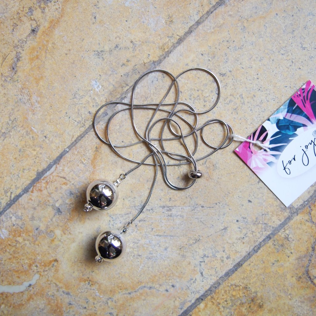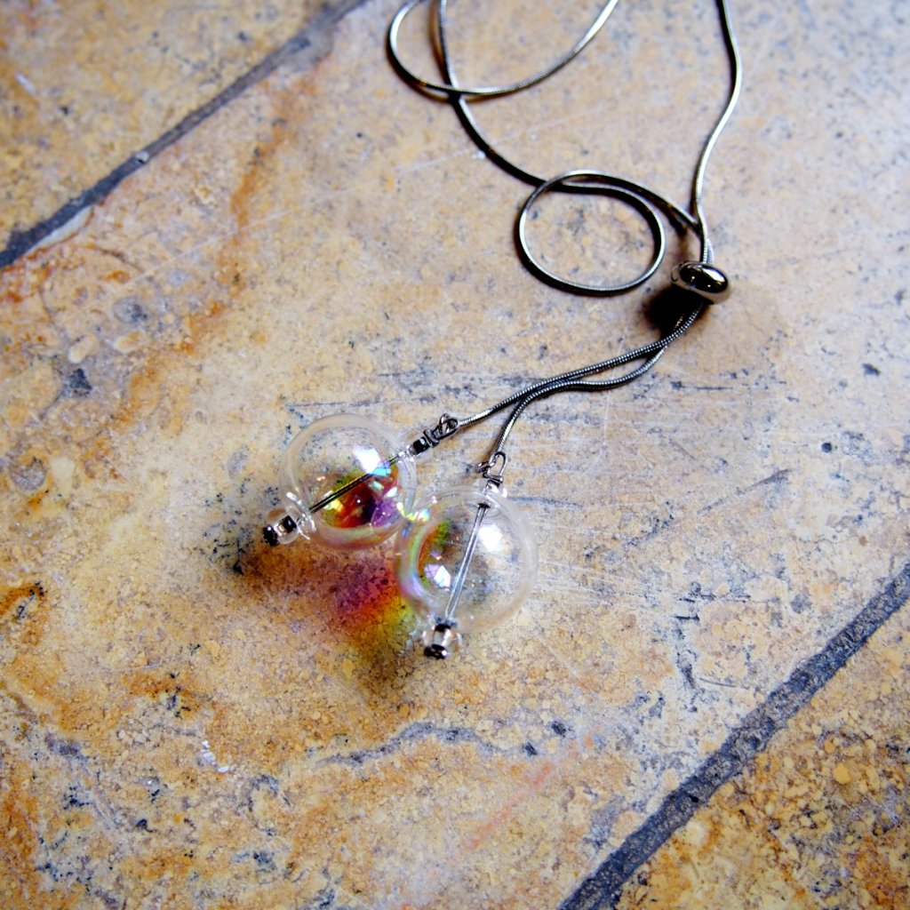 Dva skleněné korálky z ručně foukaného skla visí na jemném řetízku z nerezové oceli o délce 78 cm. Díky stříbrnému kroužku si můžete nastavit, jak vysoko či nízko budou korálky tančit – podle nálady, šatů nebo okamžiku. Skleněné korálky mají průměr 1,5 cm. Každý je jedinečný díky ručnímu foukání a odleskům, které zachycují světlo jinak v každém pohybu.