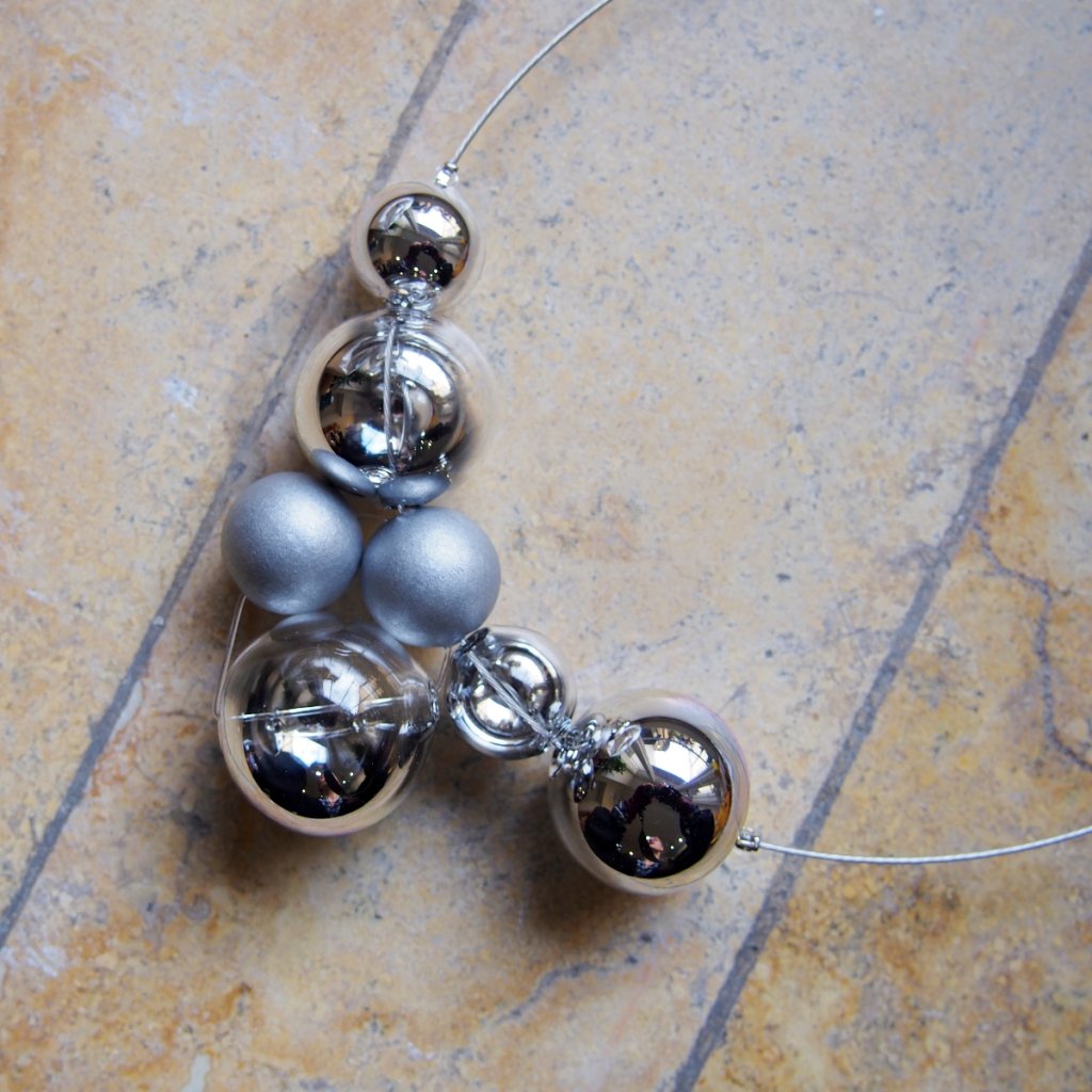 Na stříbrné dvojité stuze o délce 100 cm se v rytmu světla a pohybu houpá sedm foukaných skleněných korálků – tři o průměru 3 cm a čtyři o průměru 2 cm. Spolu tvoří hrozen, který se třpytí a ladně mění v odlescích, jak se pohybuješ.