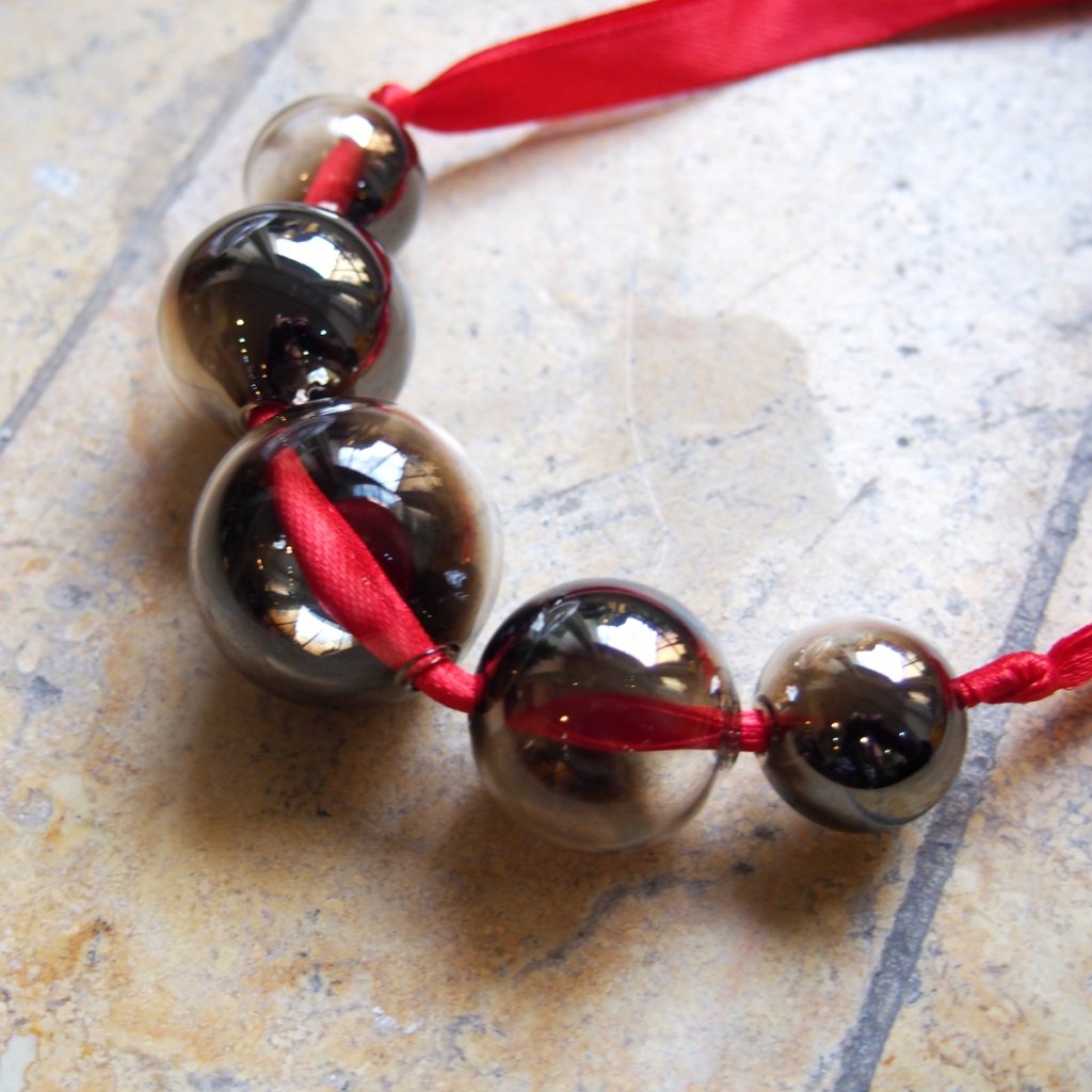 Pět skleněných korálků z lehce ztmaveného foukaného skla, velikostí od 2 do 3 cm, se jemně houpe na červené saténové stuze dlouhé 100 cm. Zavazuje se na mašličku, takže pokaždé může vypadat trochu jinak – podle tebe.
