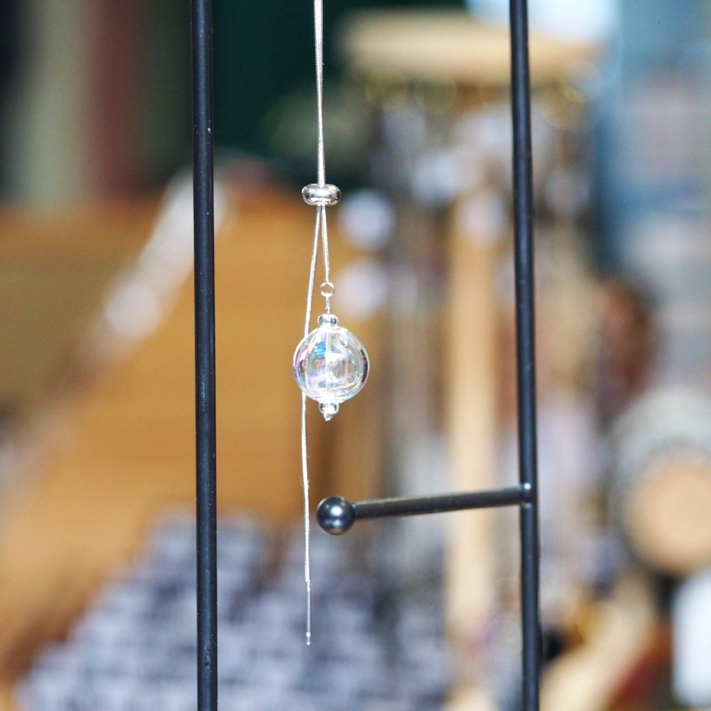 Skleněný korálek z ručně foukaného skla visí na jemném řetízku z nerezové oceli o délce 54 cm. Stříbrný kroužek ti umožní posunout korálek výš nebo níž – podle šatů, nálady nebo světla, které tě právě obklopuje.